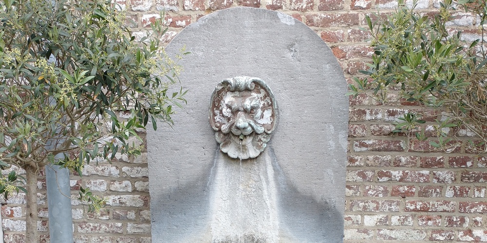 In die tijd bestond het zogenaamde kasteel tot aan de kasteeltoren alleen uit nutsgebouwen, o.a. stallen en schuren. Uit de bek van de leeuwenkop boven de drinkbak stroomt een straaltje water afkomstig uit een waterbron, die ontspringt in een 10 m. diepe put, in de 17de eeuw gegraven achter het kasteel bij de vroegere tiendschuur, nu gerenoveerd voor ontvangstzaal, Grimaldizaal genaamd. ± 3 m. vanaf de bovenkant van de put is een trechter geplaatst, waar de waterbron ontspringt, die daarin instroomt.
