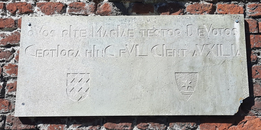 De plaquette is in 1937 onthuld door mgr. Lemmens tijdens een Mariaverering. Er is een Latijnse tekst op afgebeeld en tevens het wapen van de heren van Stein en een wapen met een zespuntige ster met in de schildvoet twee golven.