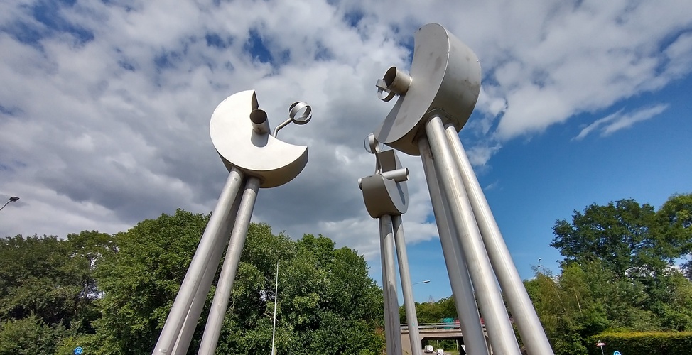 Dat hield in dat het kunstwerk het zicht niet mocht belemmeren en dus een open structuur moest hebben. Derde voorwaarde was dat het kunstwerk demontabel moest zijn. De bewuste rotonde ligt namelijk op de route van zware en omvangrijke transporten van en naar D.S.M. en het kunstwerk mag uiteraard hiervoor geen obstakel zijn. Het kunstwerk bestaat uit drie dragers, die naar elkaar leunen en samen drie halve maan-vormige elementen omhoog lijken te stuwen. De halve manen op hun beurt duwen en dragen ieder een “negatieve”, bolvormige ruimte.