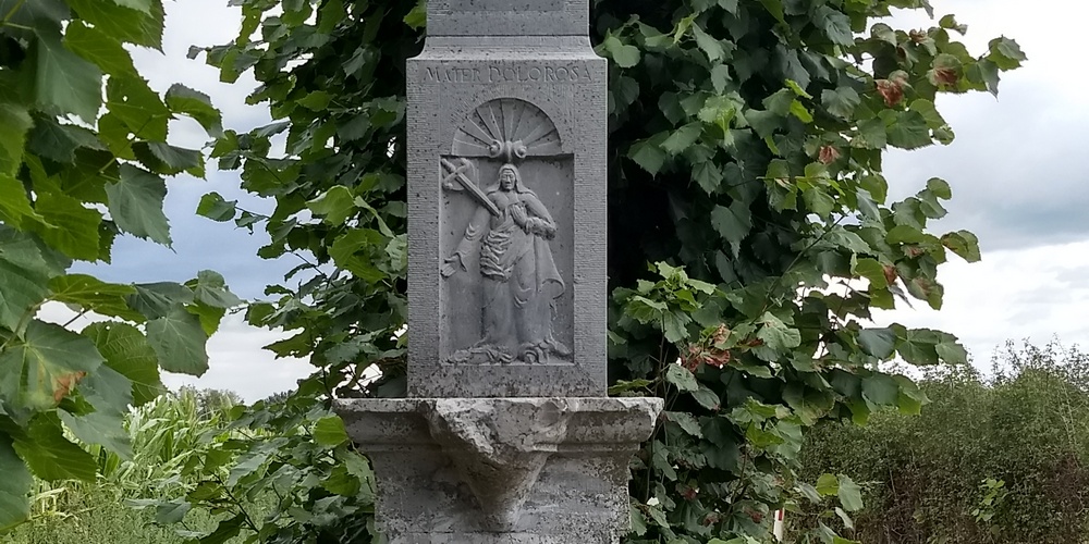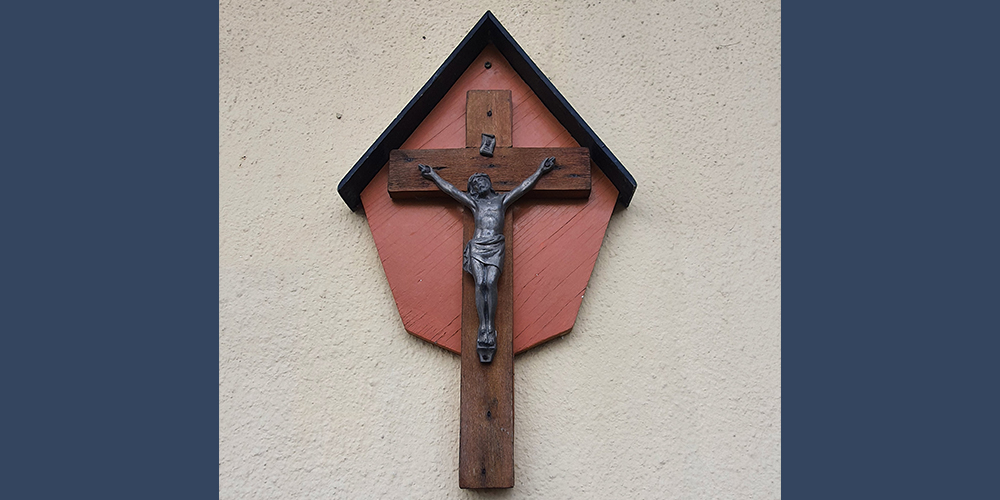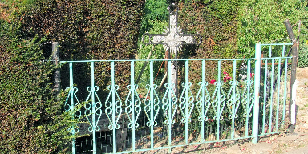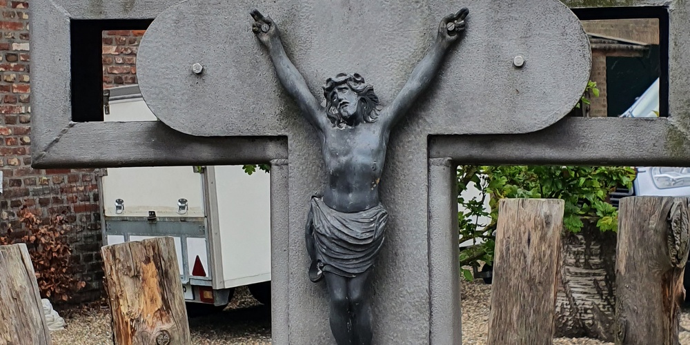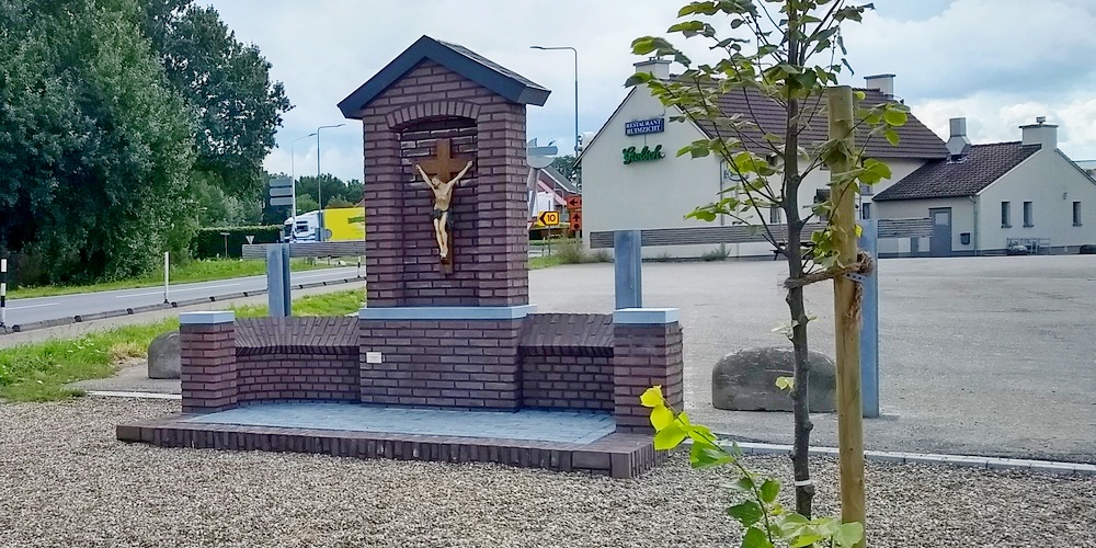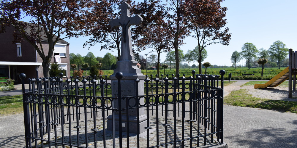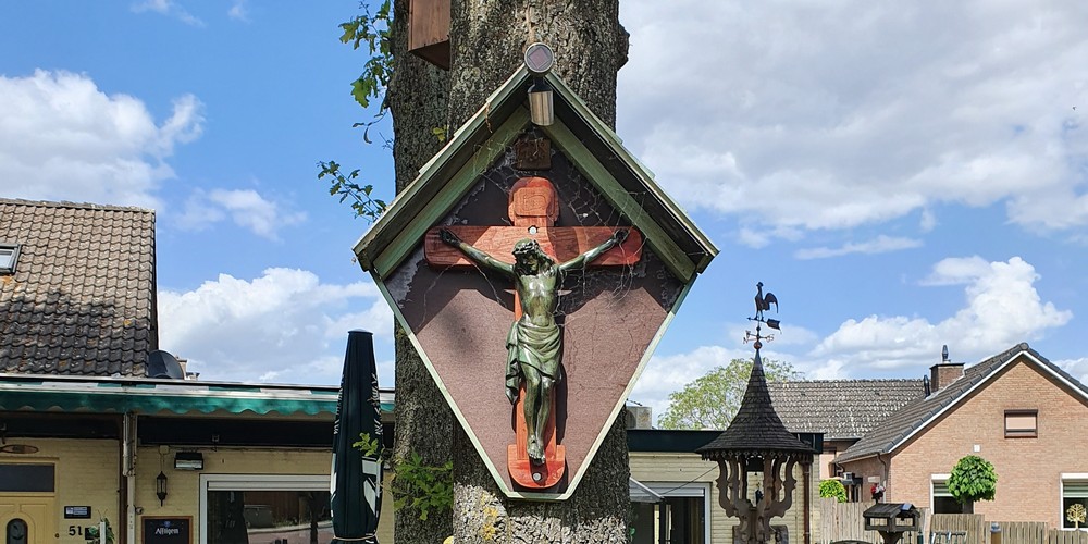 Ter rechterzijde voor de spoorbrug in Terhagen, langs de weg die omhoog gaat naar het lage bos, is tegen een eeuwenoude lindeboom, die door snoei en ouderdom een karakteristiek aanzien heeft gekregen, een kruis beeld en corpus geplaatst dat ongeveer…