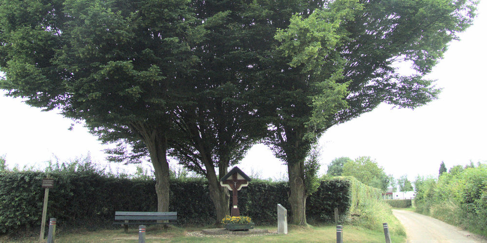 Het kruis met corpus is door de familie Pijpers-Bours geschonken aan de buurtvereniging. Rond het kruis zijn een drietal smalle groene haagbeuken geplaatst. Het geheel werd onderhouden door Giljam van Es, die deze werkzaamheden van zijn overleden broer Toon had overgenomen. Na een wandeling door bos en velden is dit een mooi en stil plekje om even te rusten. In 2020 is het geheel nog eens goed geverfd door ons lid Hub Vaessen.