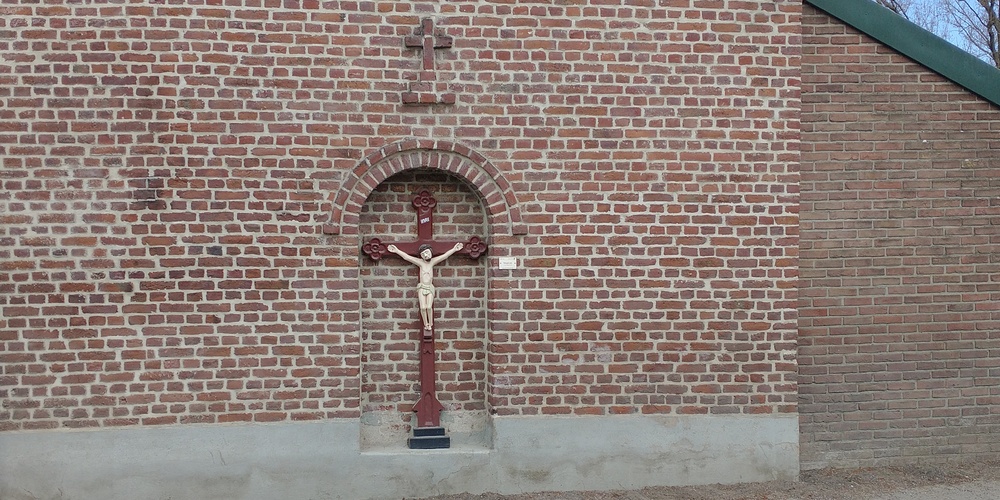 Midden boven de halve ronde boog is iets vooruitstekend op het metselwerk een kruisje op een voetje geplaatst. Voor die tijd zou een kruis gestaan hebben aan de veldweg naast de boerderij. Of dit kruis het originele uit die tijd is of later vernieuwd, is niet bekend. In 2010 werd het kruis voor restauratie verwijderd. Een attente inwoner van het kerkdorp had in de lege nis een bordje geplaatst met de tekst “ Kruis weg.” Gedeeltelijke verrotting door weer en wind was de oorzaak dat de omlijsting van het voeteinde was aangetast. De verflaag van kruis en corpus was door inbijten van cementstof poreus geworden. Het mooie goed geconser-veerde kruis is door de gezusters Vaessen altijd prima verzorgd.