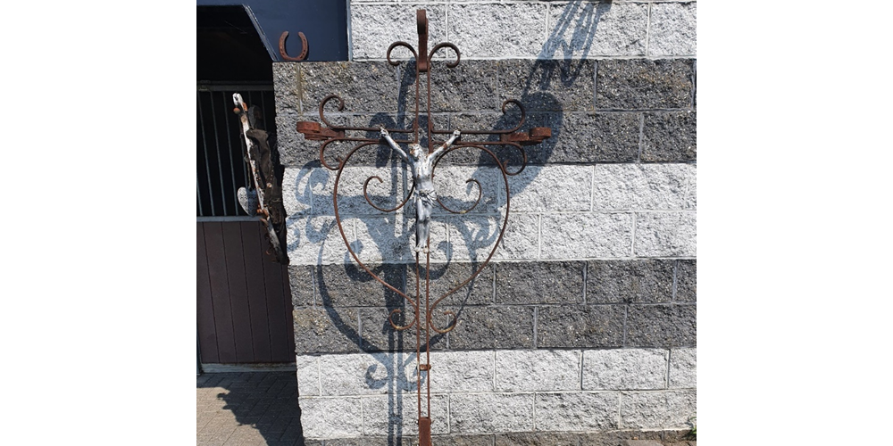 Het is een gietijzeren corpus (frans van origine) op een smeedijzeren kruis.