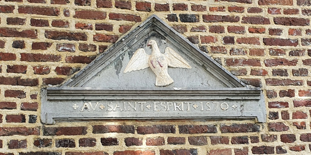 Het fronton, daterend uit 1570, voorstellende de H. Geest in de gedaante van een witte duif, met het opschrift: *AU Saint Esprit* 1570* ( In de Heilige Geest ), zat waarschijnlijk in de gevel boven de ingang van het gasthuis. Zekerheid hierover is er niet, men sprak ook dat Waalse schippers het fronton mogelijk mee gebracht hadden.